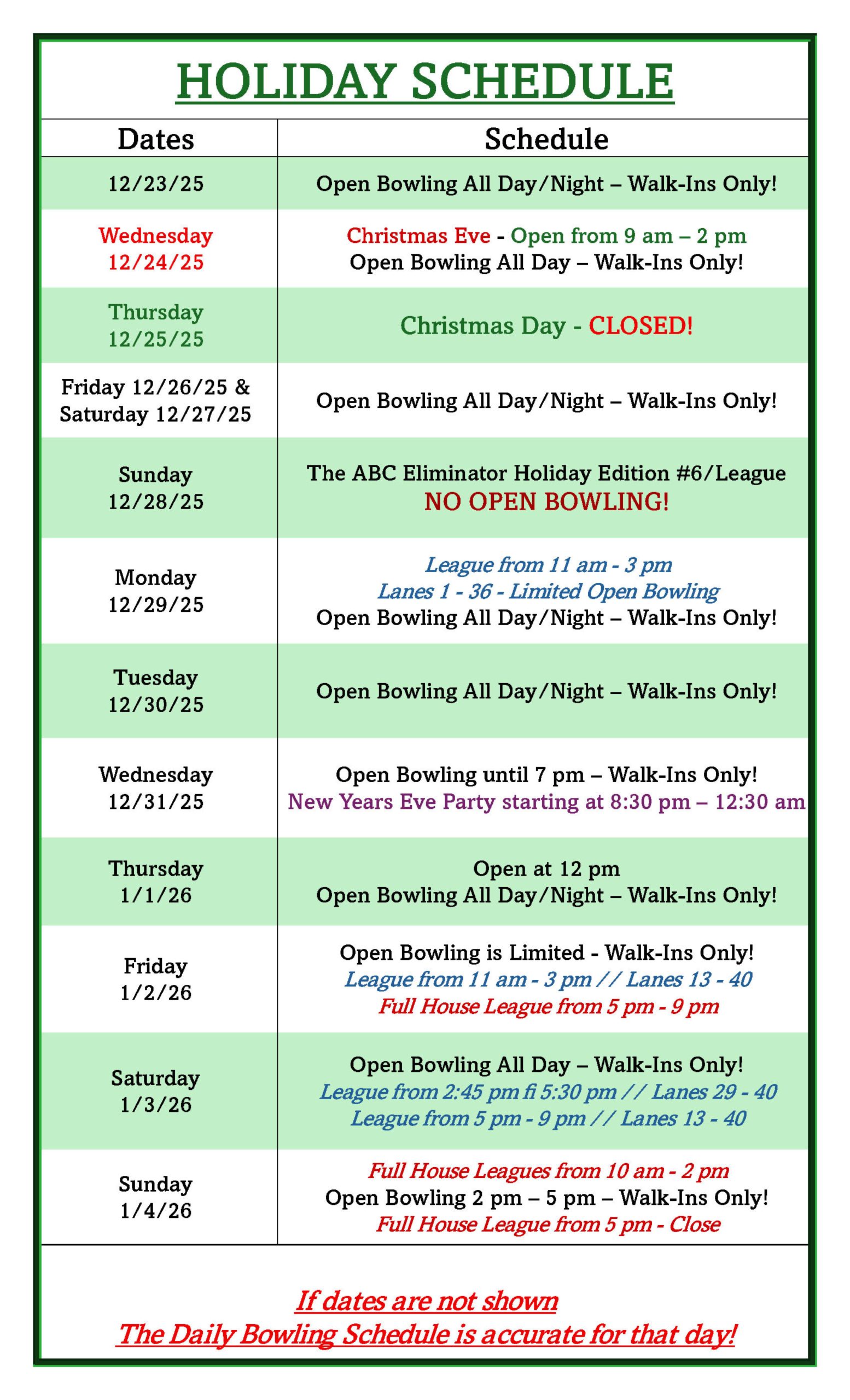 The website to check on free lane times does not reflect events for that day. I wish that there was a more user-friendly, heads-up calendar of events during the time of open lane bowling.