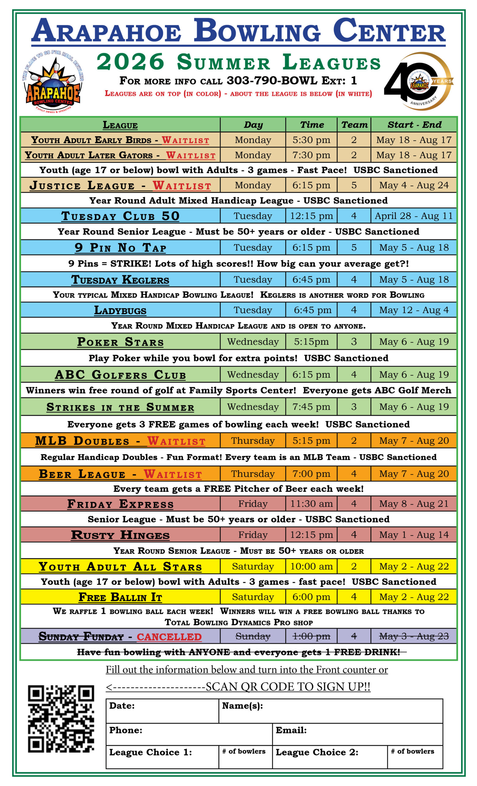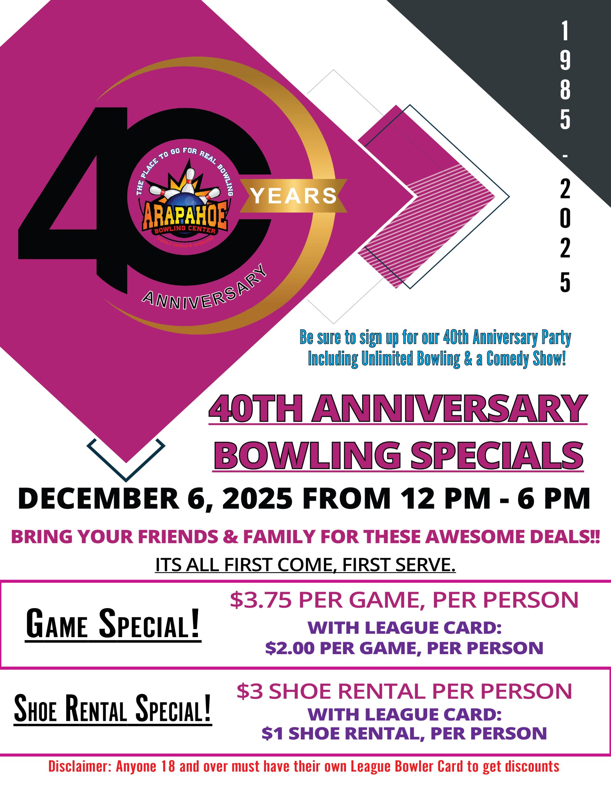 Started bowling there this summer on the Wednesday night trios. I’ve heard so much about Arapahoe and it’s all been great.. Let me tell you the staff there did not disappoint. Always friendly and great service. I’v decided to join a fall league as well. Thank you Arapahoe Bowling Center!!!!!