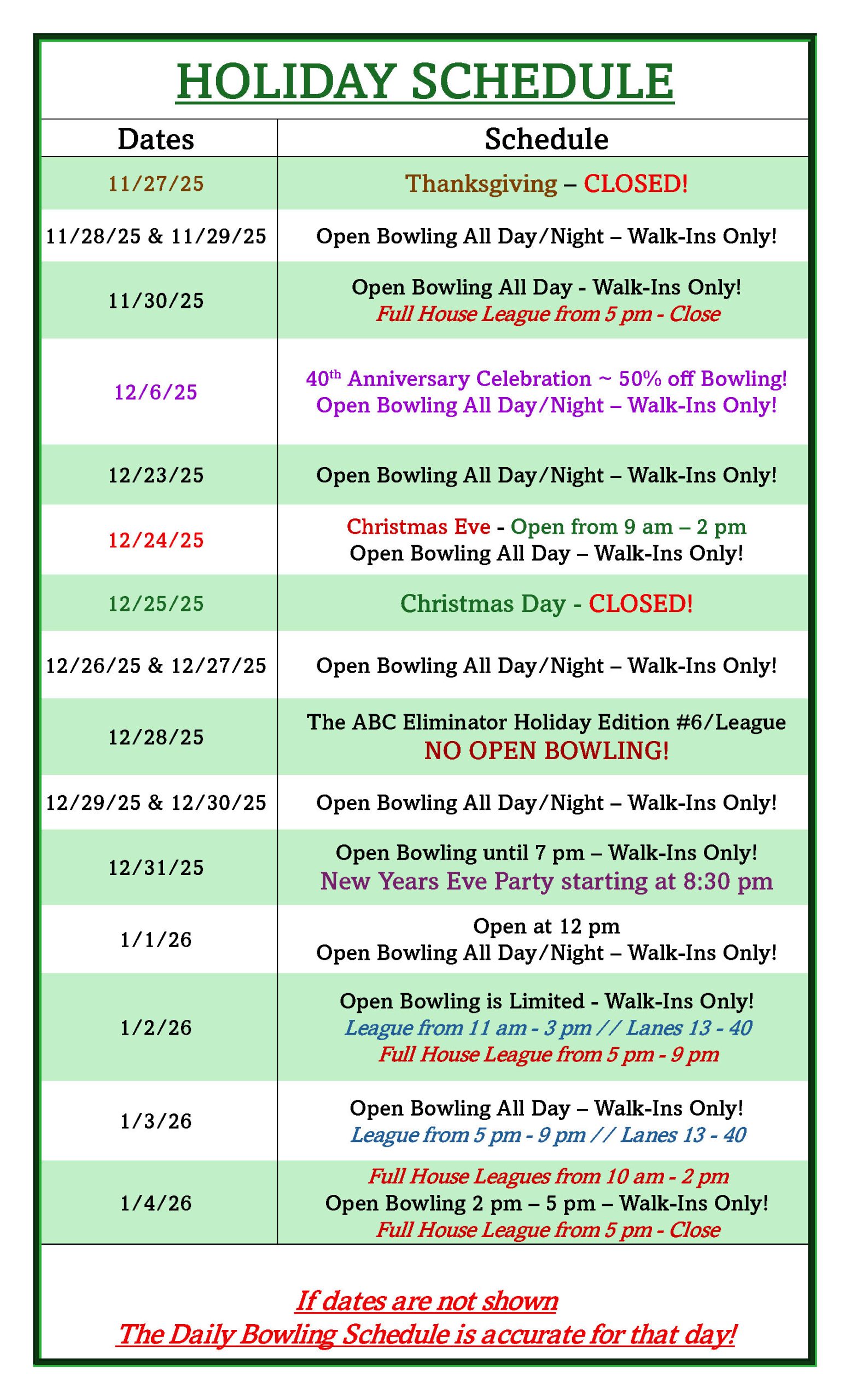 The website to check on free lane times does not reflect events for that day. I wish that there was a more user-friendly, heads-up calendar of events during the time of open lane bowling.